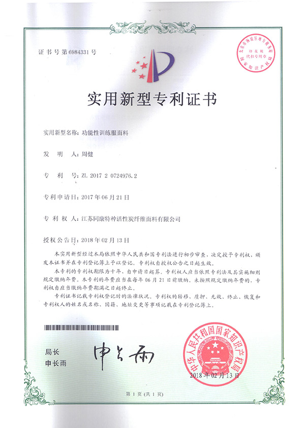 專利證書功能性訓練服面料