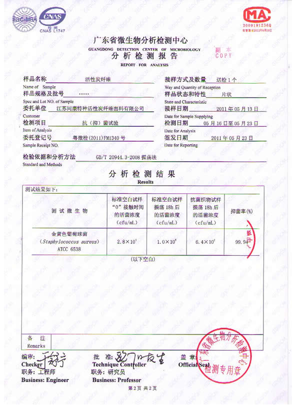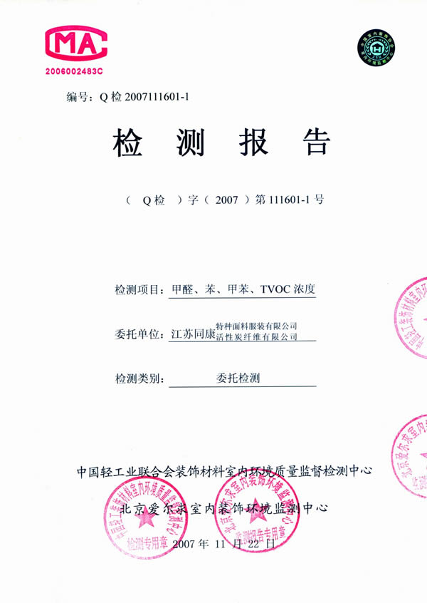 江蘇同康特種活性炭纖維公司生產(chǎn)的活性炭纖維居室凈味寶、汽車凈味寶獲得國家專利,特別適用于新裝居室、汽車或及新置家具里各種有害物質(zhì),尤其是致癌物質(zhì)、芳香族類的化合物(如苯類、醛類)的去除,使空氣潔凈清新,有利人體身心健康。該產(chǎn)品經(jīng)中國室內(nèi)裝飾協(xié)會環(huán)境監(jiān)測中心檢測對甲醛、苯、甲苯、有機(jī)揮發(fā)物(TVOC)的消除有明顯作用。